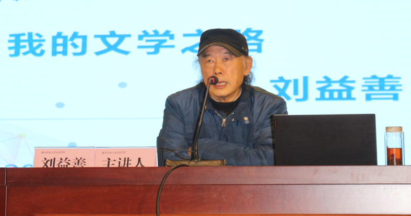 讲座中,刘益善从“乡村的民俗文化在我心中播下了文学的种子”、“阅读与写作改变了我的道路让我从事起文字工作”、“编出好作品、写出好文章是我的文学人生,也是我的职业要求”三个方面对他的文学之路进行了概述:小时候非常喜欢阅读、听乡村艺人说书讲故事,在他心中播种下了颗文学的种子,于是致力于通过自己的文字来感染读者,陶冶、净化自身灵魂。参加工作后,以“长江不断流,文学旗不倒”、“爱职业、爱作者、爱稿件”、“三梯队论”作为编辑的三点理念,培养出了一批又一批优秀作家。