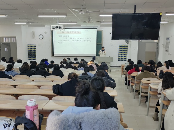 人文学部马芝兰教授以现代汉语第三章第二节《汉字的形体》为内容现场授课。教学过程中她教态自然、语调亲切,教学环节逻辑清晰、衔接流畅。用大量图片展示现行汉字的前身演变过程,提升了学生学习文字的直观感和真实感,调动了学习积极性。在师生互动中,马芝兰注重启发诱导,循循善诱,激发学生回答问题,凸显学生学习主体性,整体呈现出松弛有度、轻松和谐的课堂氛围。