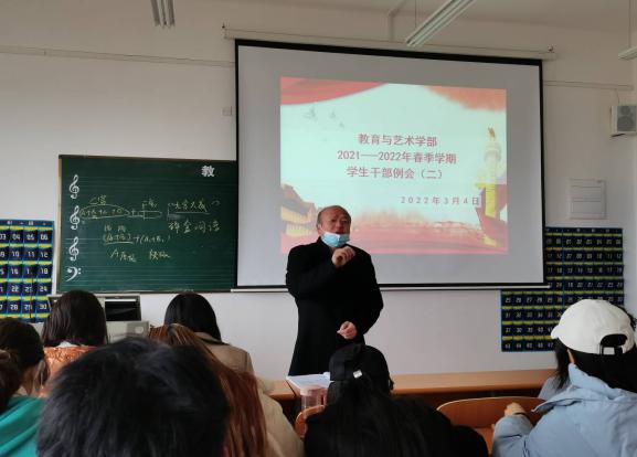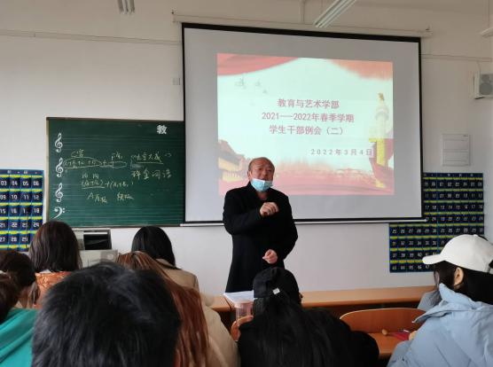 2022年3月4日中午12:00,教育与艺术学部按照惯例在实验楼一栋403多媒体教室组织召开学生干部工作例会。出席本次会议的人员有辅导员老师、团学会干部及各专业班级负责人。会议由党总支书记李先华主持。