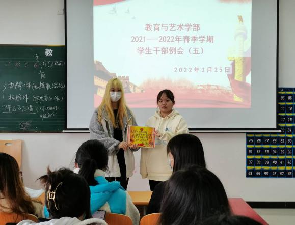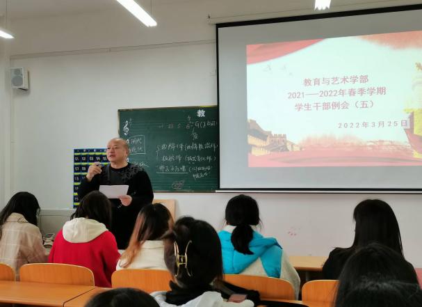 2022325日中午1200,教育与艺术学部按照惯例在实验楼1-403多媒体教室组织召开学生干部工作例会。辅导员、团学会干部及各专业班级班长参加。会议由党总支书记李先华主持。