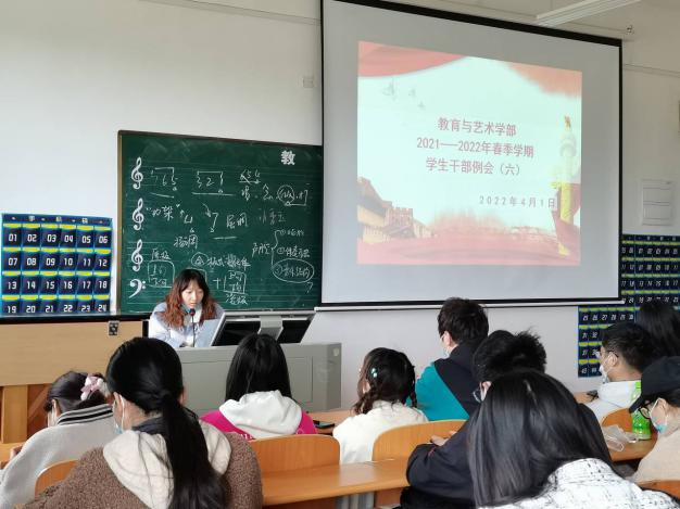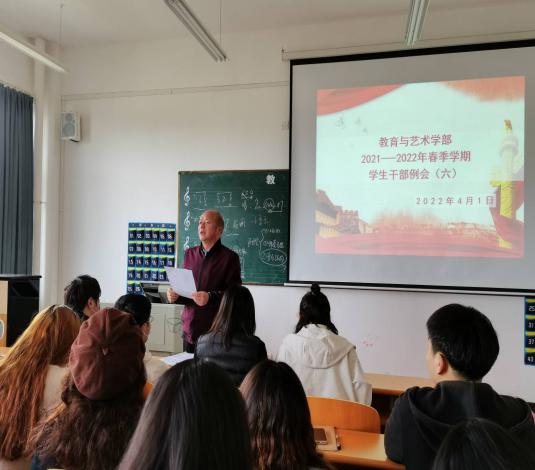 2022年4月1日中午12:00,教育与艺术学部按照惯例在实验楼1-403多媒体教室组织召开学生干部工作例会。出席本次会议的人员有辅导员、团学会干部及各专业班级班长。会议由党总支书记李先华主持。
