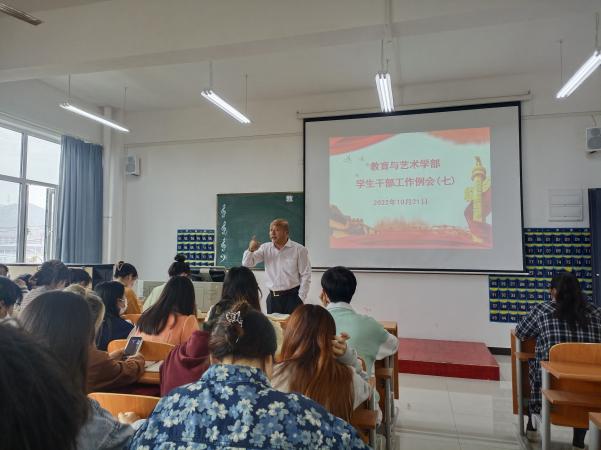 20221021日中午1200,在实验楼1-403多媒体教室组织召开学生干部工作例会。学部各辅导员、全体团学会干部及各专业班级负责人到会,工作例会由总支书记李先华主持。