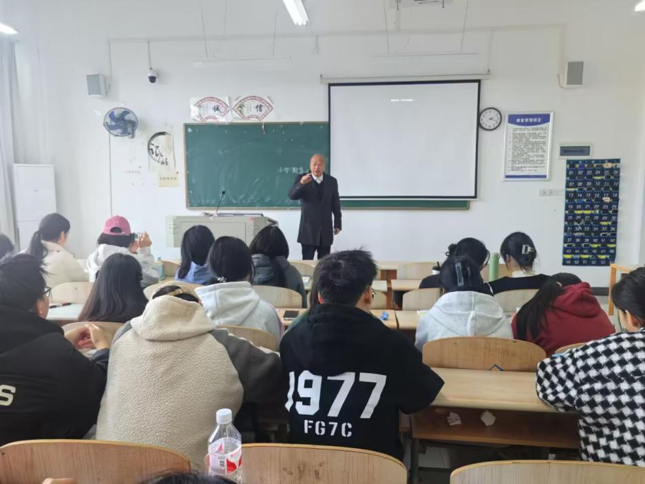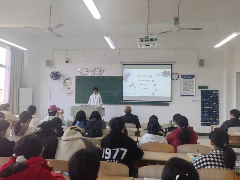 为巩固良好班风学风的建设,切实抓好小学教育、学前教育专业“课前十分钟”的技能训练活动,2024年11月21日下午2:00,教育与艺术学部党总支书记李先华全体辅导员一行前往教学楼2B406小学教育2202班课堂聆听“课前十分钟”的建设情况张露同学带来的说课《搭石》,通过阐述教材与学情、教学目标及重难点、教学方法,以及模拟授课,既展现了她个人专业能力,又充分体现了小学教育专业的特色,表现较为突出总支书记在总结发言时高度认可了学生说课的方法:语言精简、通俗易懂,彰显了高年级学生的文化素养,同时在冬季来临和接近期末考试之际,从学习和生活两方面对同学们提出两点要求:一是认真学习,打下扎实基础,备考期末;二是注意人身安全,加强户外锻炼,增强体质,防范安全隐患。杜绝使用违规电器、饲养宠物等,遵守校纪校规