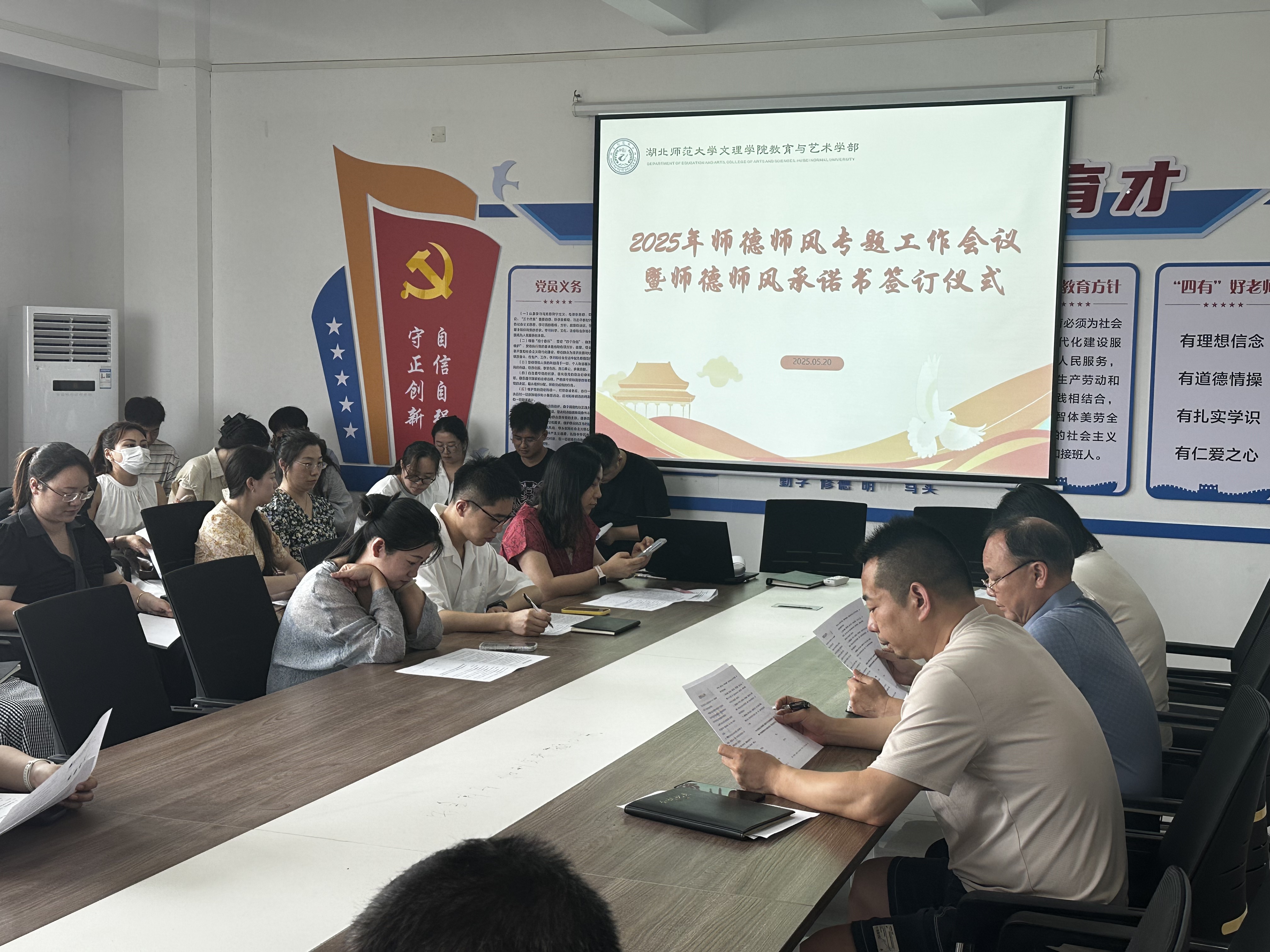 为进一步加强教师队伍建设,提升师德师风水平,扎实推动各项工作有序开展,教育与艺术学部于2025年5月20日中午在实验楼1-404会议室召开了师德师风建设专题会暨5月工作例会。教育与艺术学部全体教职工参加了会议,会议由胡蕾老师主持。
