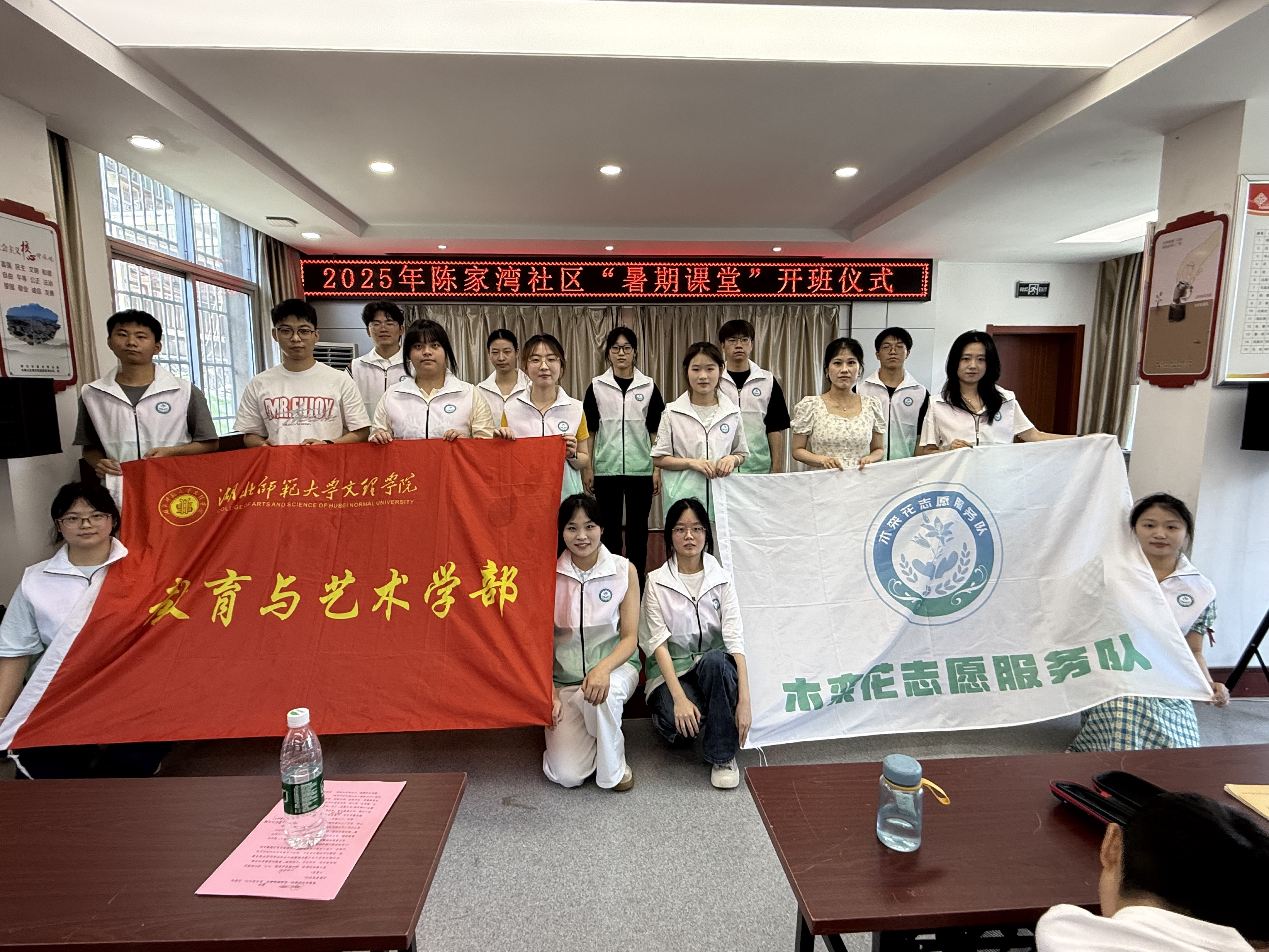 2025年6月30日上午9时,教育与艺术学院木栾花志愿服务队“七彩假期”暑期爱心托管班启动仪式在黄石市陈家湾社区隆重举行。社区党委书记陈小玲,教育与艺术学院团总支书记谭青、志愿服务队指导老师刘东辉,木栾花志愿服务队全体成员及社区居民代表、青少年儿童共同参与活动。