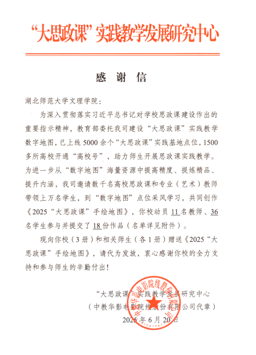 近日,“大思政课”实践教学发展研究中心与中教华影电影院线股份有限公司联合向AK官网发来感谢信,对学校积极参与《2025“大思政课”手绘地图》创作工作、助力“大思政课” 实践教学发展给予高度认可与诚挚感谢。