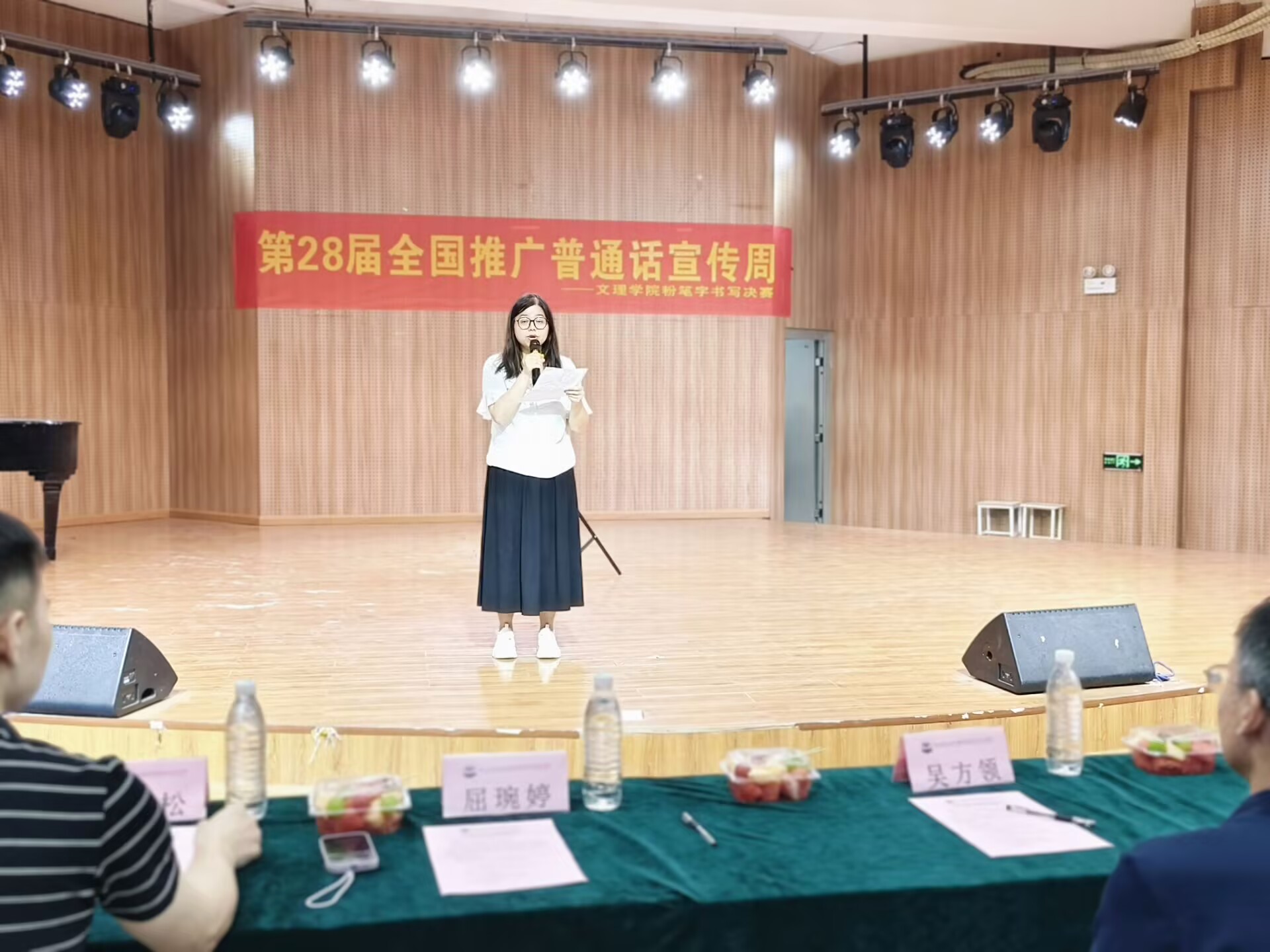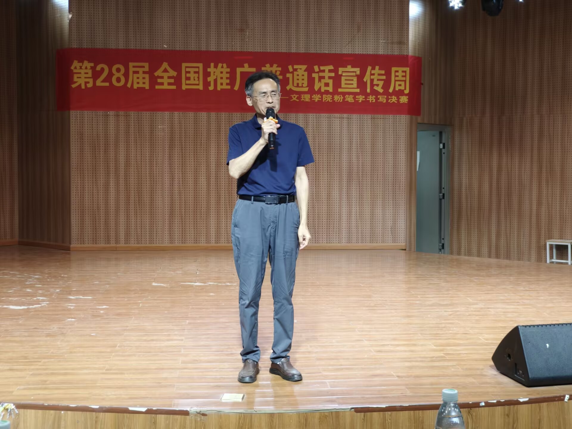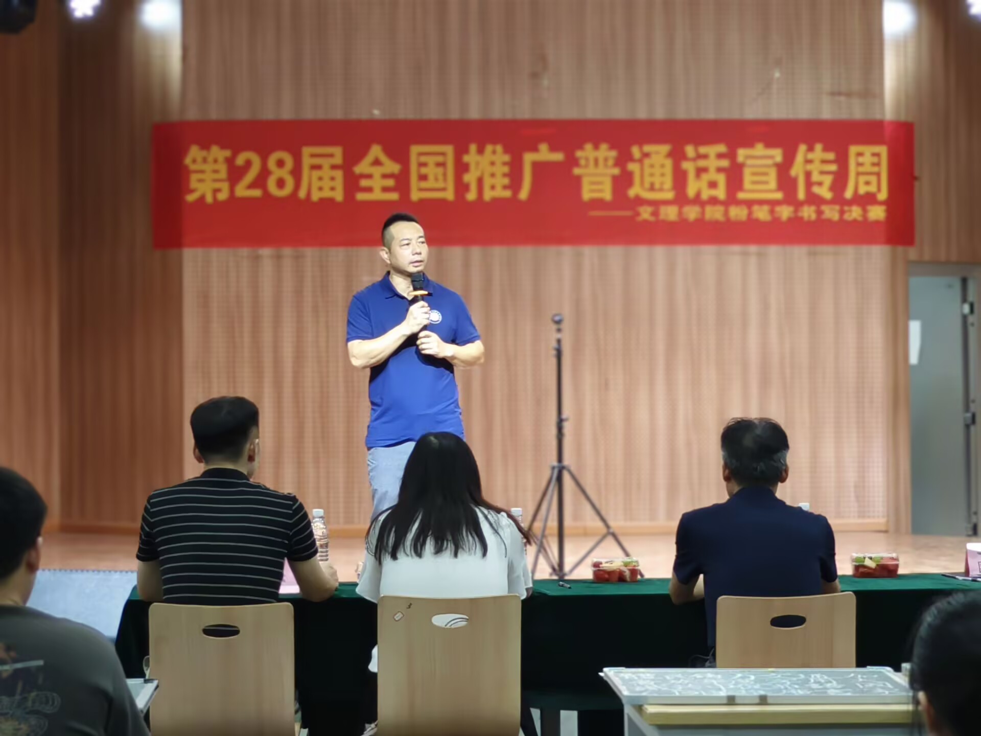 比赛特邀校语委办屈琬婷老师及教育与艺术学院党总支副书记陈小龙、吴方领教授、李松老师、王雷老师等担任评委。屈老师代表校语委办代表校语委办,预祝本次书写比赛圆满顺利,期待同学们在规范书写中传递文化力量!随后陈书记为活动致辞,陈书记强调,规范汉字书写是传承中华文化、增进民族认同、提升师范生素养的关键,并对选手寄予殷切期望。