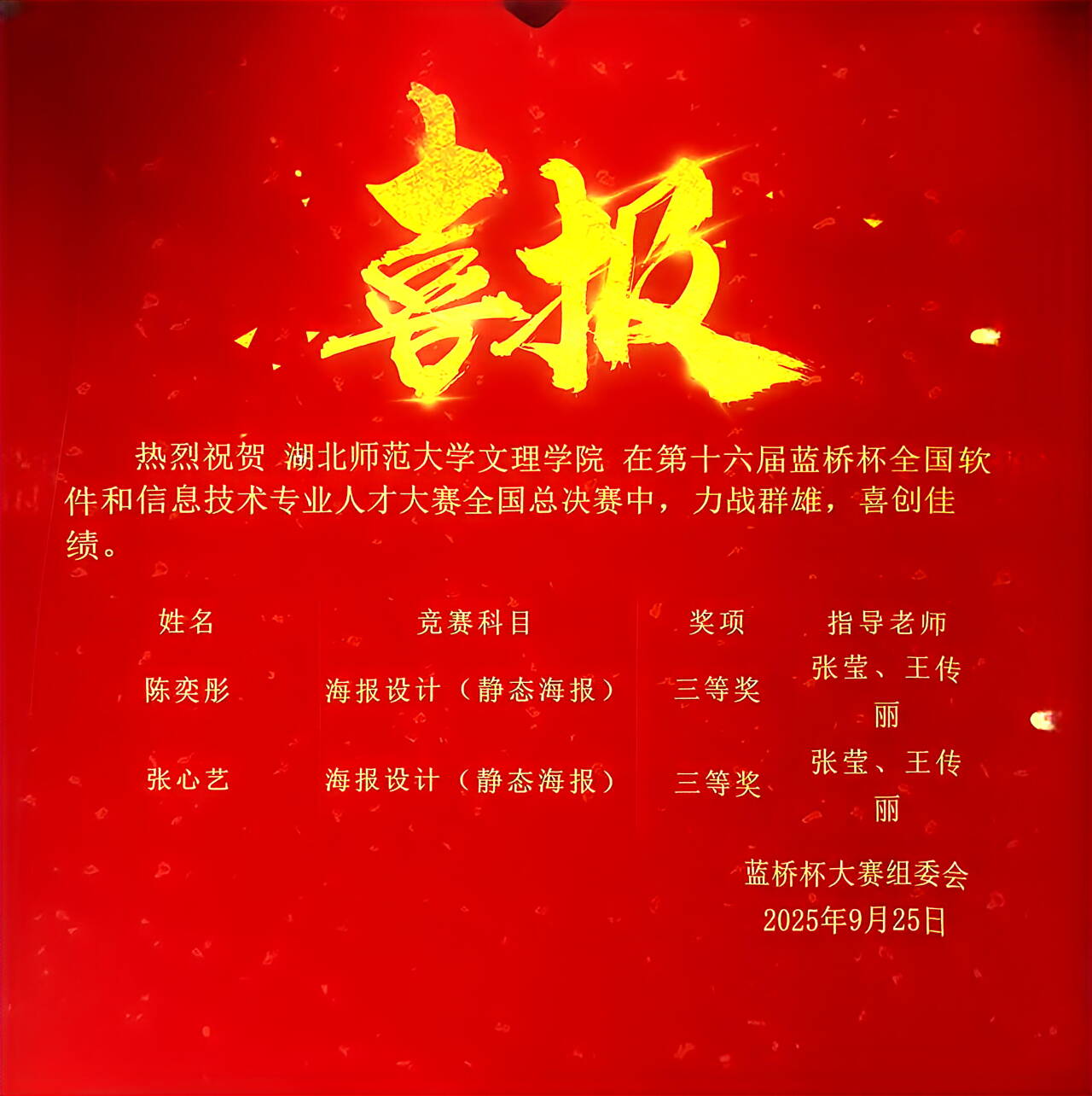 近日,第十六届“蓝桥杯”全国软件和信息专业技术人才大赛全国总决赛落下帷幕。AK官网艺术与教育学院美术专任教师张莹、王传丽指导学生参赛,在视觉艺术设计平面设计赛道中脱颖而出,斩获全国三等奖,不仅为学校赢得荣誉,更一举突破本校在该赛事中的学生获奖历史记录,书写了艺术与技术融合育人的崭新篇章。
